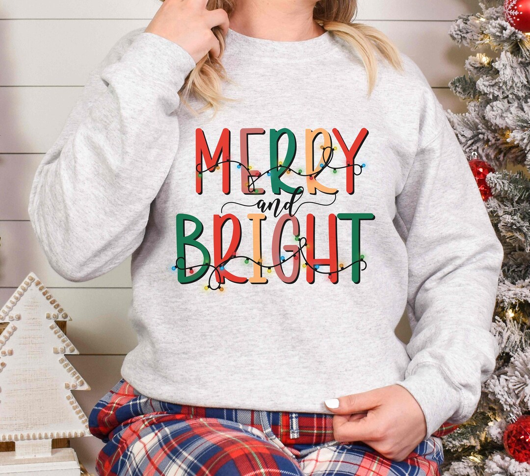 Merry and Bright Christmas Sweatshirt Christmas Shirts Sweater Holiday Sweatshirts Pullover for Her Christmas Light Bulbs Colorful