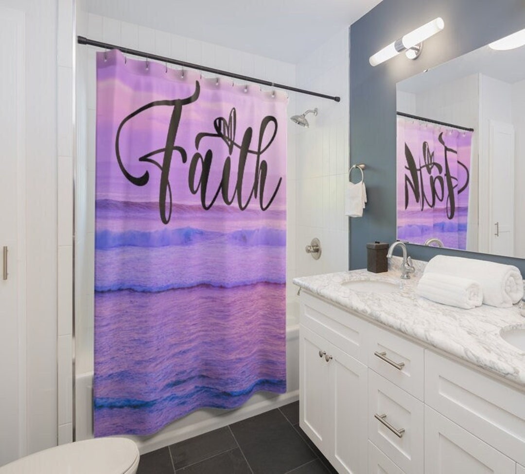 Faith Waves Shower Curtain Christian Bathroom Home Decor Lavender Ocean Theme Bath Curtains Minimalistic Art Beach House Theme Nautical by 3DCandleCreations