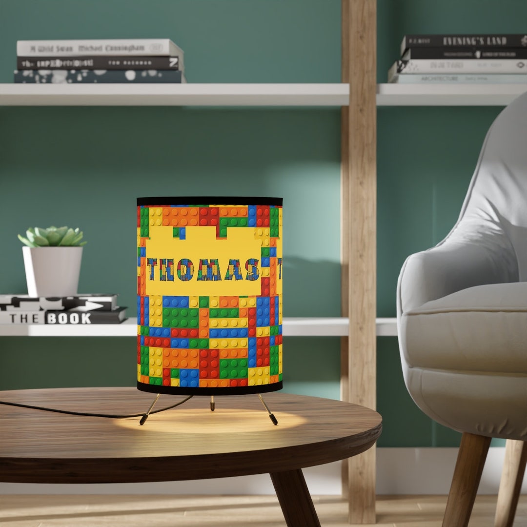 When function met aesthetics, this tripod lamp with a personalized building block lampshade was born. Featuring a galvanized steel tripod base, this lamp delivers both high-end durability and a unique personalized building block desing. The lampshade has high-resolution art that adds your personality to your bedroom childs hangout.