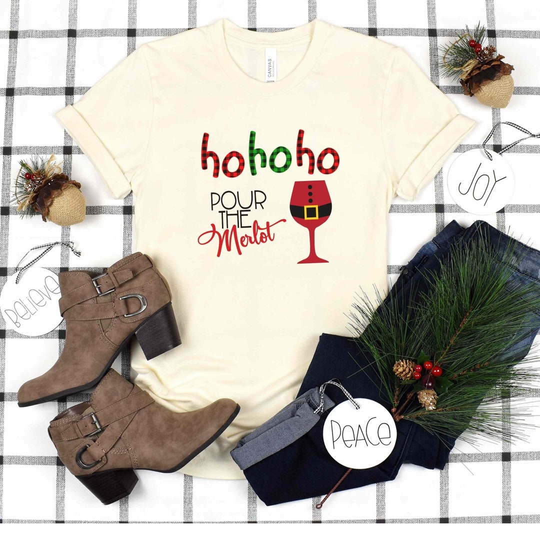 Whether you're sipping on merlot by the fireplace or enjoying the festivities with friends and family, this "Ho Ho Ho Pour the Merlot" Christmas shirt is the perfect addition to your holiday wardrobe.