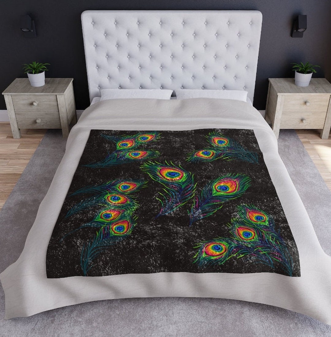 Peacock Feathers Crushed Velvet Blanket Throw Blankets Home Decor Gift for Her Couch Accent Soft Cozy Decorative Display Housewarming Gifts by 3DCandleCreations