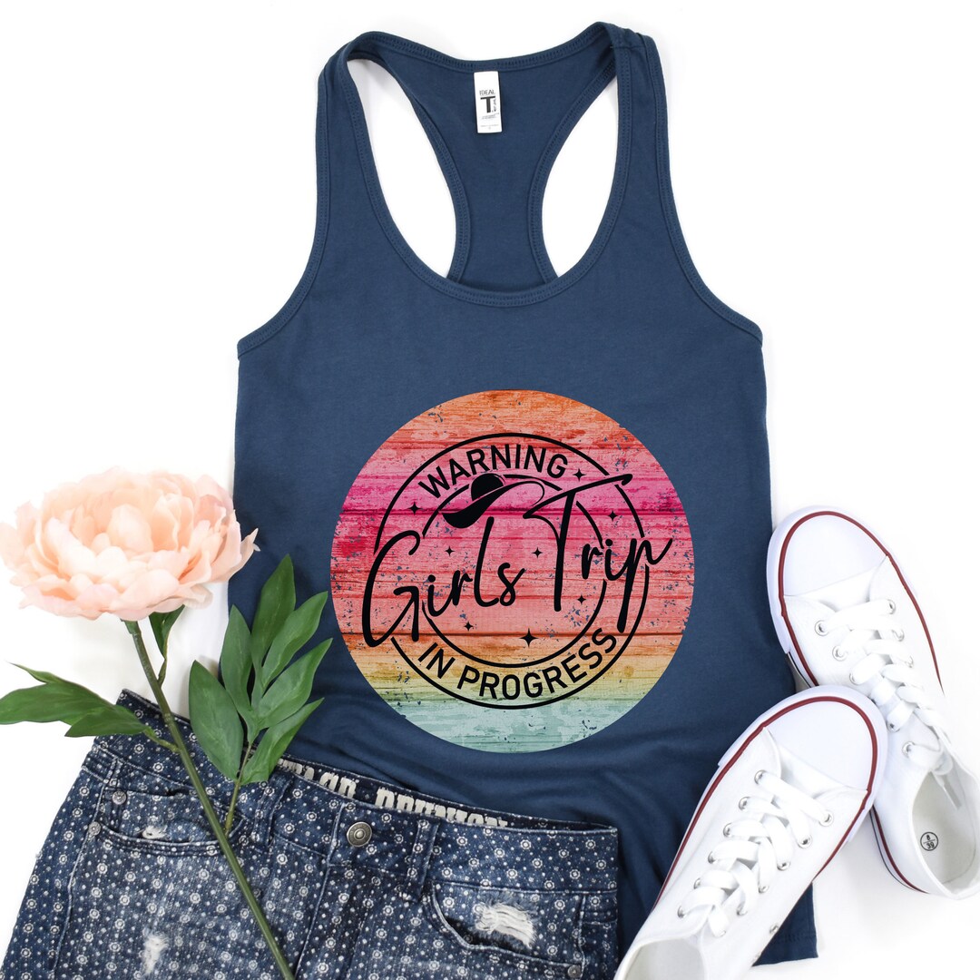 The high-quality "Warning Girl's Trip in Progress" graphic design on this slim-fit tank-top will turn heads. This is the perfect gift for your trip. The racerback cut looks good on any woman's shoulders. This racerback tank is soft, lightweight, and has a flattering cut. Please check size chart for correct sizing as it runs smaller than normal. ( may need to size up 1-2 sizes)