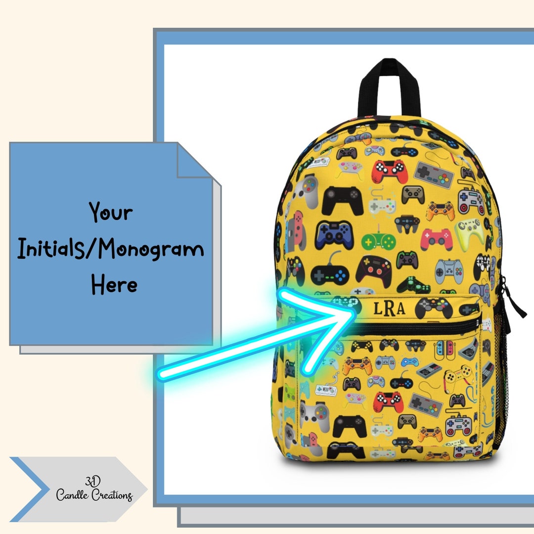 Introducing our Custom Color Video Game Backpack - the ultimate gift for gamers and gaming enthusiasts! This backpack is not only functional but also customizable with your choice of background color and monogram (initials), making it uniquely yours.