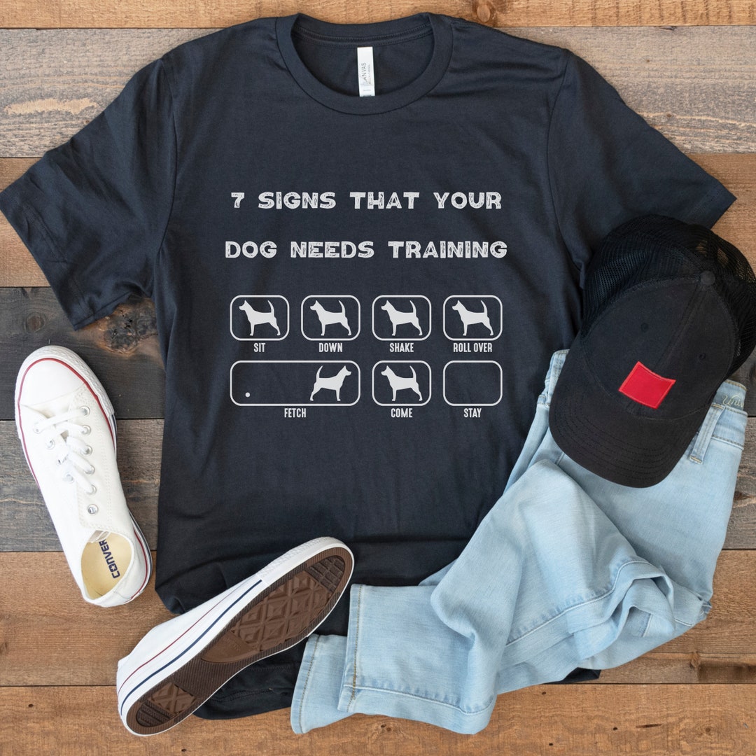 In addition to the jokes, this shirt also features "7 Signs Your Dog Needs Training" on the back, making it a great conversation starter for dog trainers and enthusiasts alike.