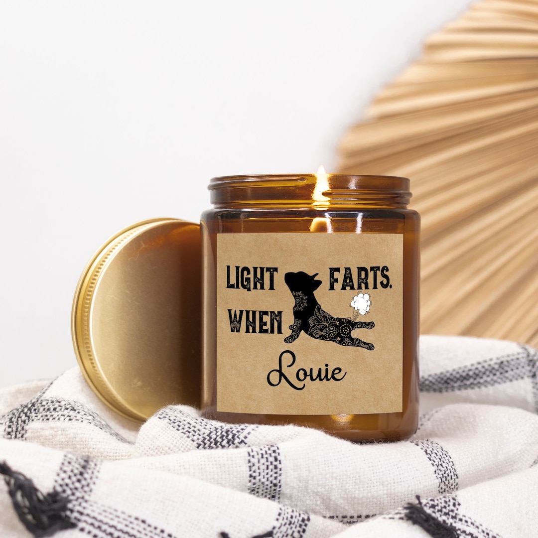 French Bulldog Candle Personalized Gift Light When Name Farts Funny Gift for Dog Lover Frenchie Mom Dog Deodorant Dog Mom Odor Amber Jar 9oz