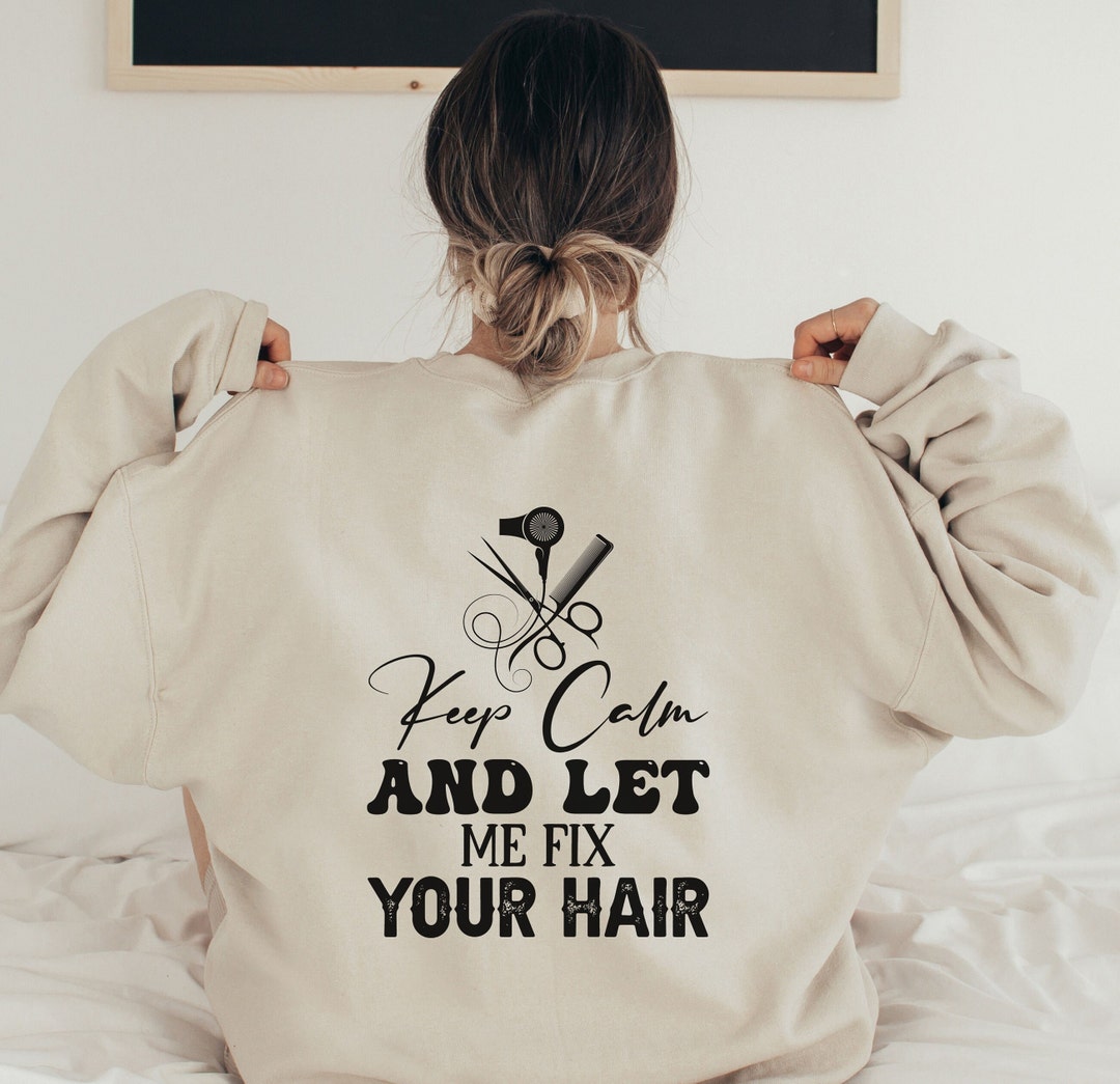 Elevate your style with our Custom Name Hair Stylist Sweatshirts and Hoodies! 🌟 Whether you're a cosmetologist, hairstylist, or just love rocking chic apparel, this collection is designed for you. Personalize your look with your name on the front, a playful "Keep Calm and Let Me Cut Your Hair" message on the back, or opt for both for a unique touch that sets you apart.