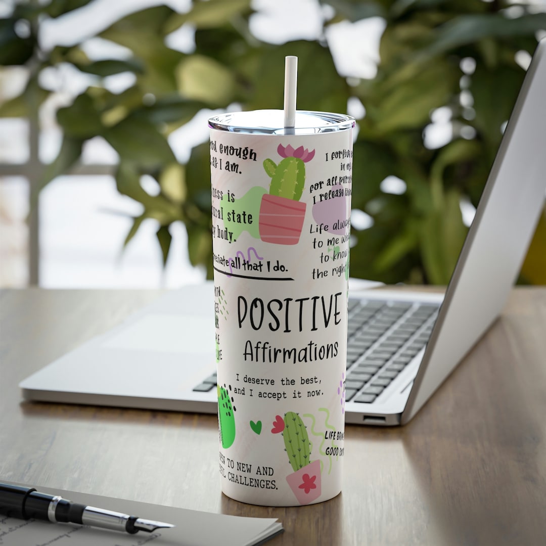 Daily Affirmations Tumbler with Straw Insulated Cup 20oz Mental Health Gift for Her Best Friend Positivity Travel Mug Cactus Succulent Gift by 3DCandleCreations