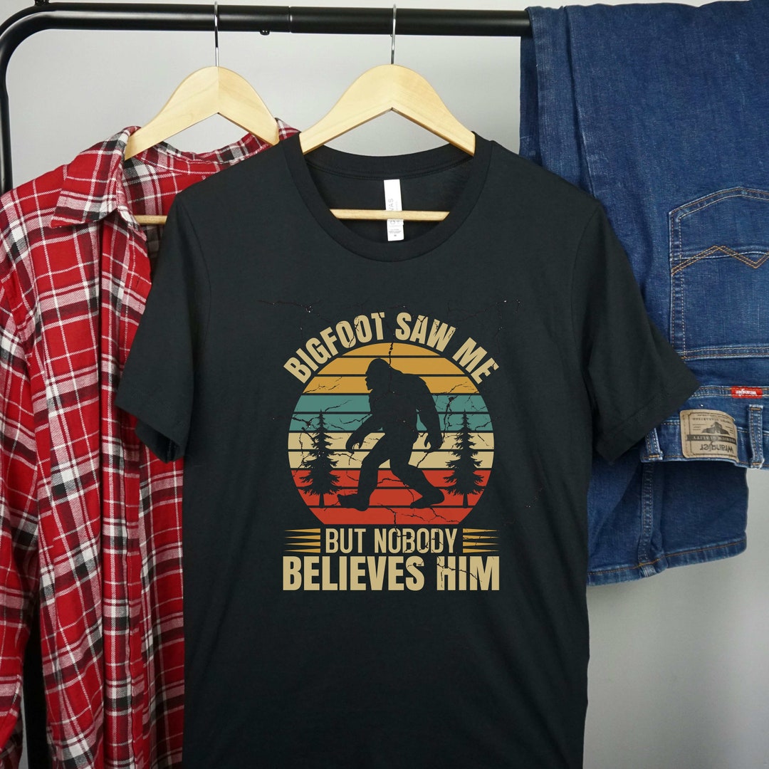 Sasquatch Shirt Funny Gift for Him Bigfoot Saw Me T-Shirt Nobody Believes Him Nature Lover Hiking Outdoor Camping Shirts Graphic Tee by 3DCandleCreations