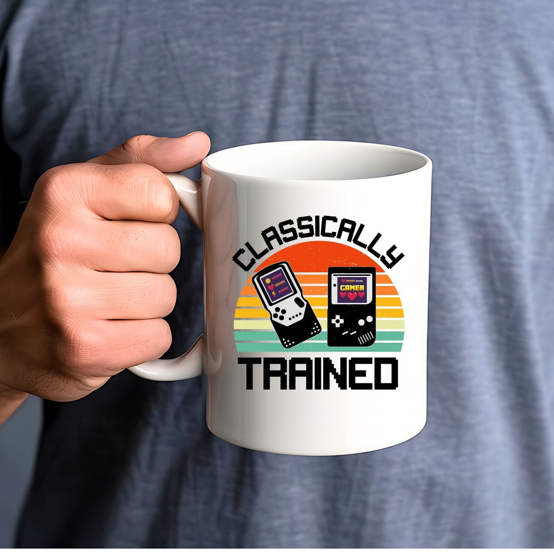 - Classic Design: Featuring the phrase "Classically Trained" alongside a retro video game graphic, this mug adds a nostalgic touch to your gaming setup.