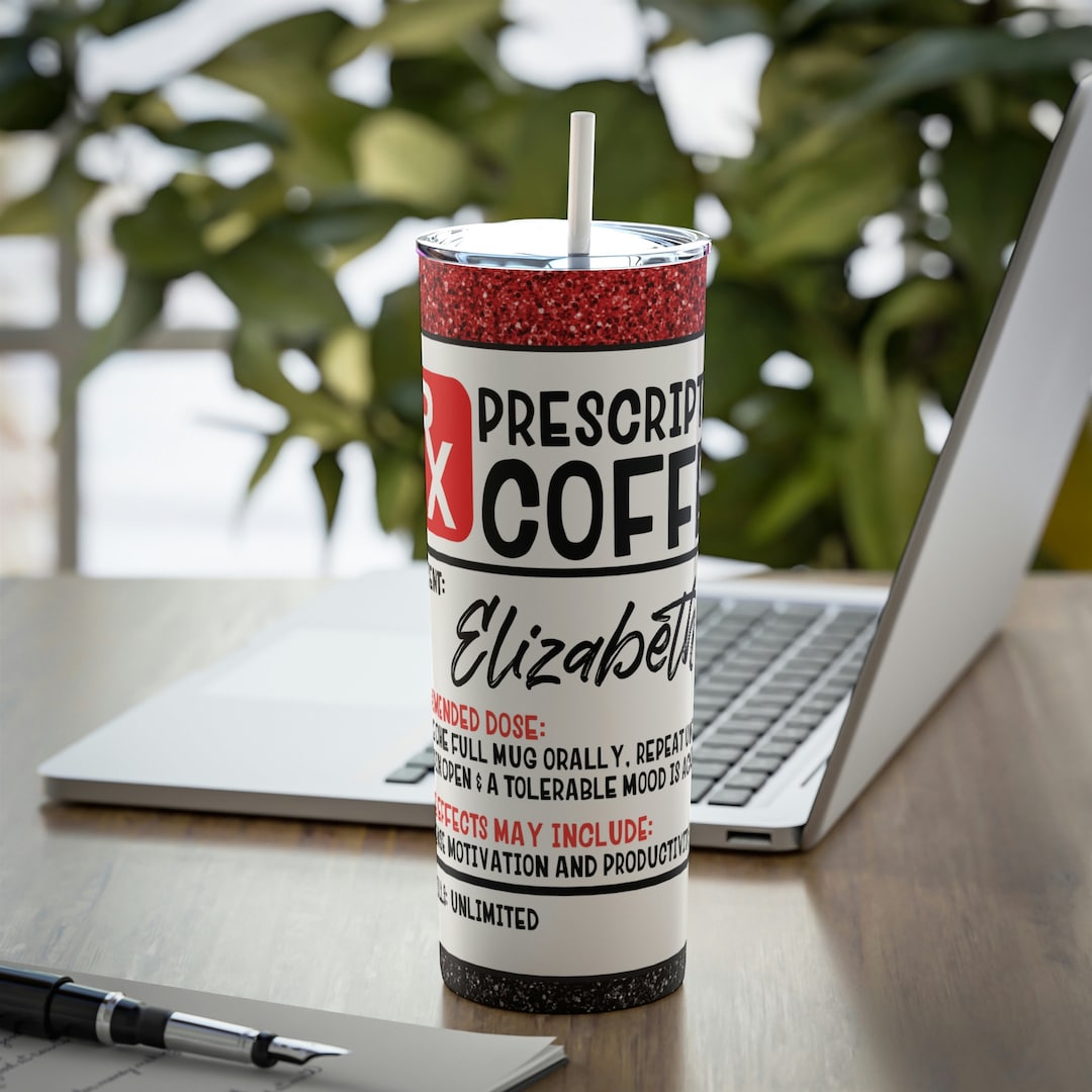 Personalized Coffee Tumbler RX Prescription Doctors Note Funny Tumbler with Straw Gift For Her Travel Skinny Insulated 20 oz Coffee Lover