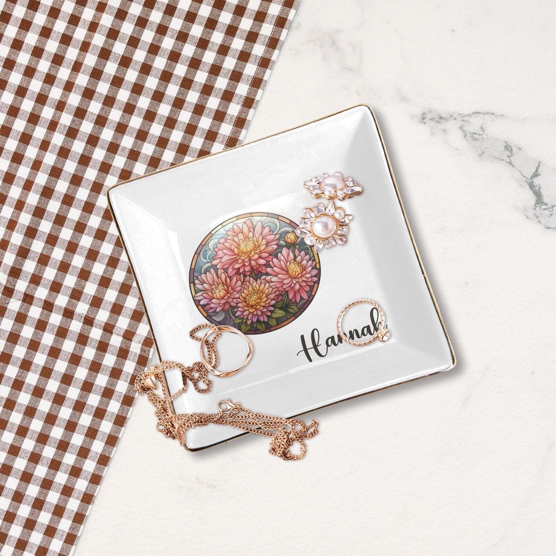 Personalized Jewelry Dish Custom Name Birth Flower Stain Glass Window Art Jewelry Tray Gift Jewelry Ring Birth Month Floral Gold Rim
