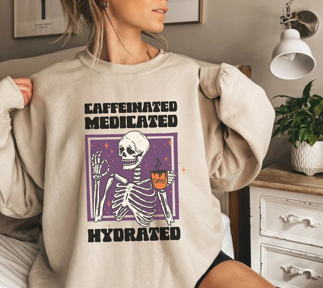 Whether you're conquering early mornings, busy shifts, or just want to showcase your witty personality, our "Caffeinated, Medicated, Hydrated" Coffee Skeleton Shirt is the perfect fit. Don't miss out on the chance to blend humor with your love for coffee. Get yours today and embrace the caffeinated life! ☕💀