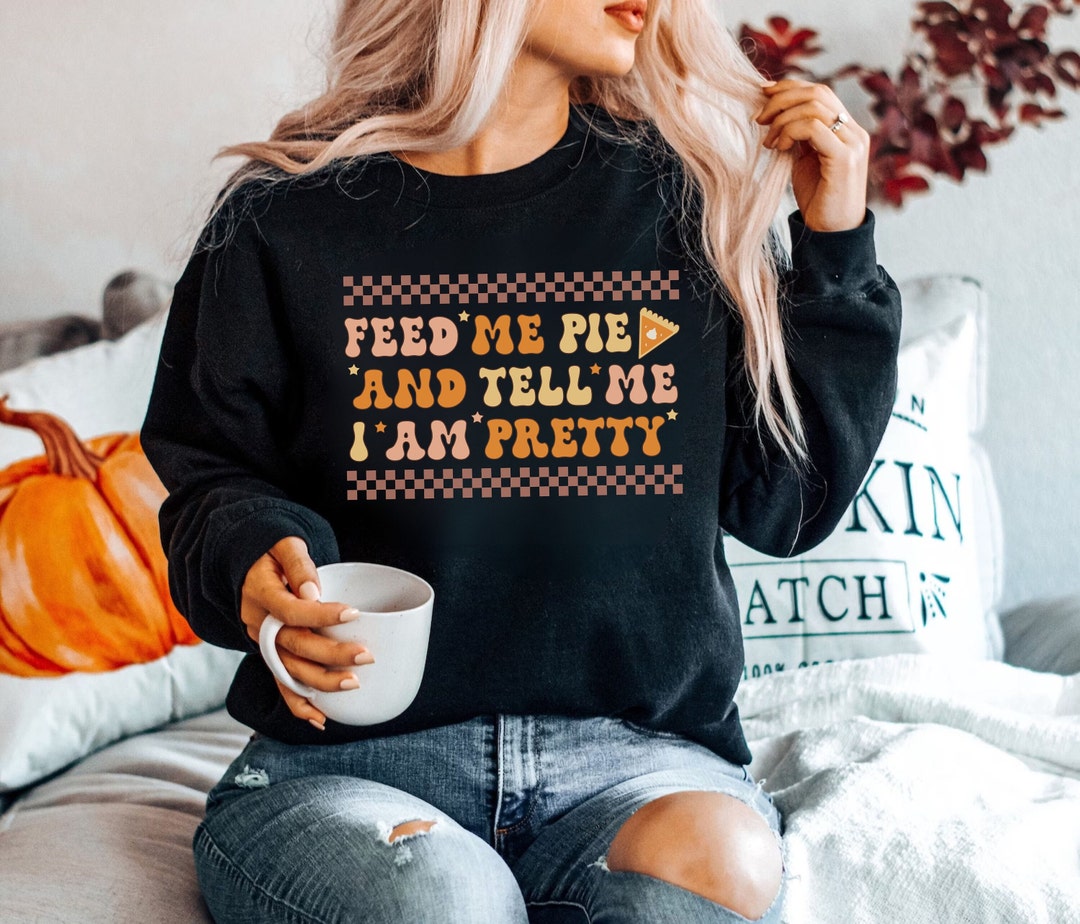 Embrace the essence of the season with our "Feed Me Pie and Tell Me I'm Pretty" T-shirt/Sweatshirt! 🥧🍂 Whether you're a pumpkin pie aficionado or simply love a touch of humor, this design is perfect for you.