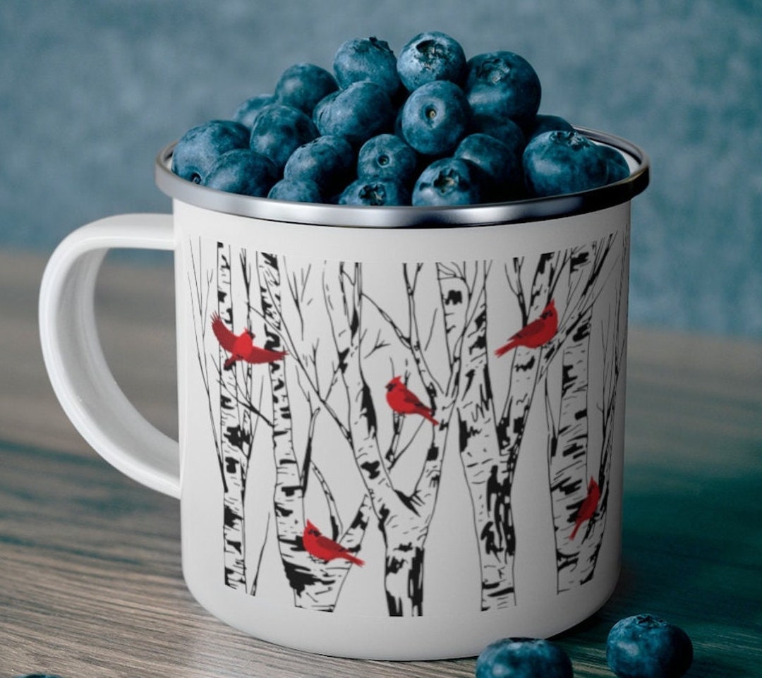 Cardinal Enamel Coffee Mug Birch Tree Cardinals Lover Gift Campfire Bird Watcher Gifts Bird Lover Gift Birds Lodge Home Decor Camping Decor by 3DCandleCreations