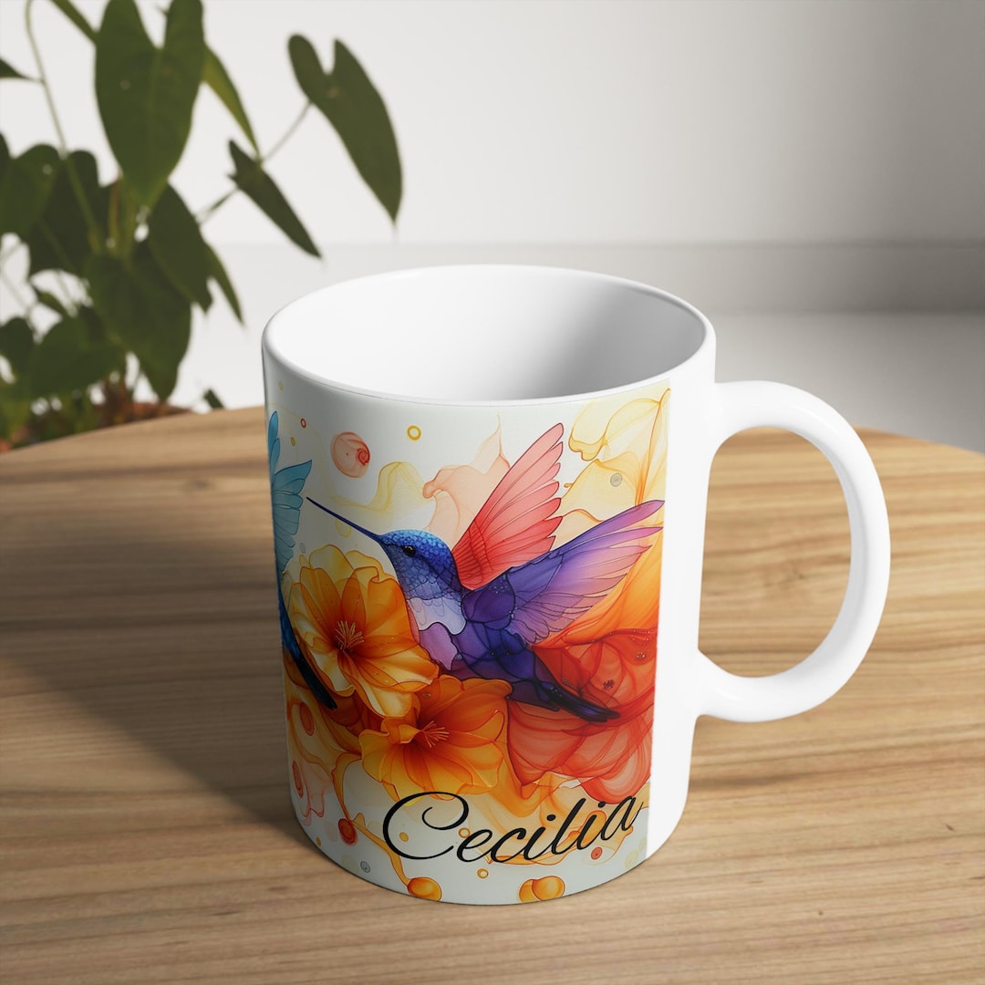 Personalized Name Hummingbird Accent Coffee Mug 11oz Flower Mug Beautiful Colors Home Decor Gift for Her Mothers Day Gift Idea Watercolor