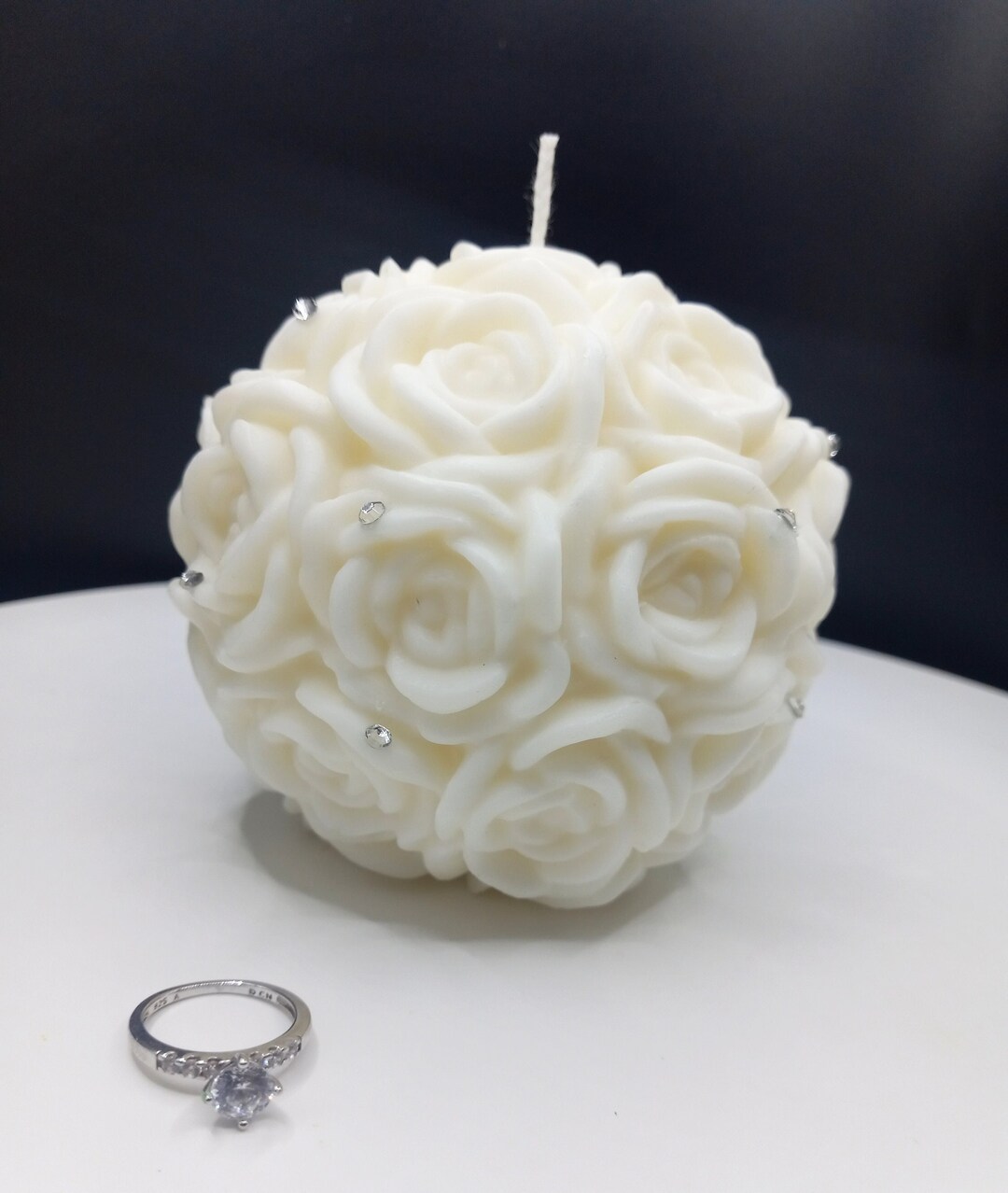 This "Rose Ball Candle" is the perfect gift for any candle lover, featuring a beautiful and unique design that looks like a 3D rose ball! Adorned with rhinestones, this candle is sure to make a statement in any room.