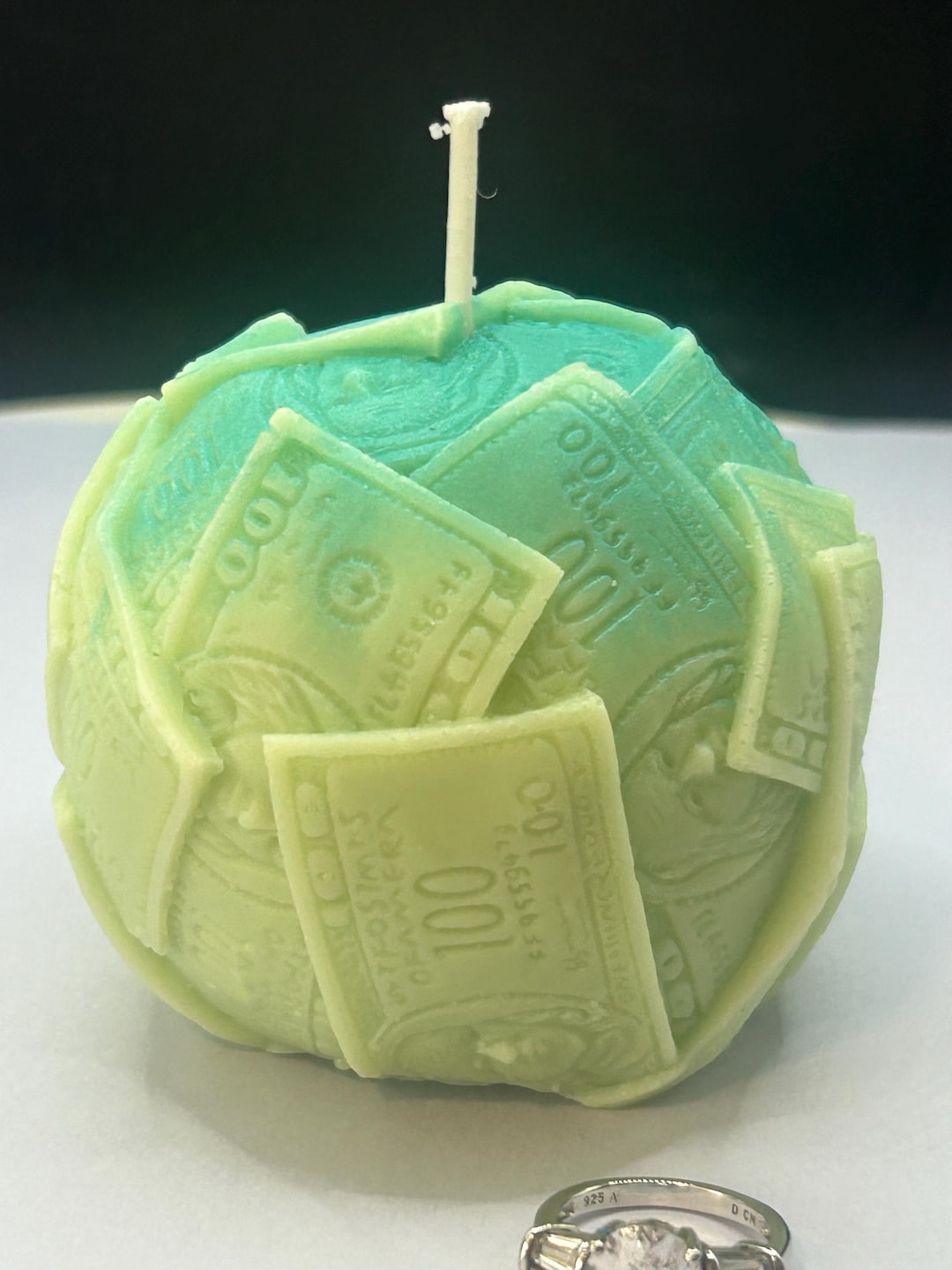 Manifest abundance with this unique Money Ball Candle — a detailed sphere candle embossed with stacks of $100 bills, symbolizing wealth and good fortune. Each candle is hand-poured with precision, creating a one-of-a-kind centerpiece that adds both charm and intention to your space. Perfect for gifting, home décor, or money-drawing rituals.