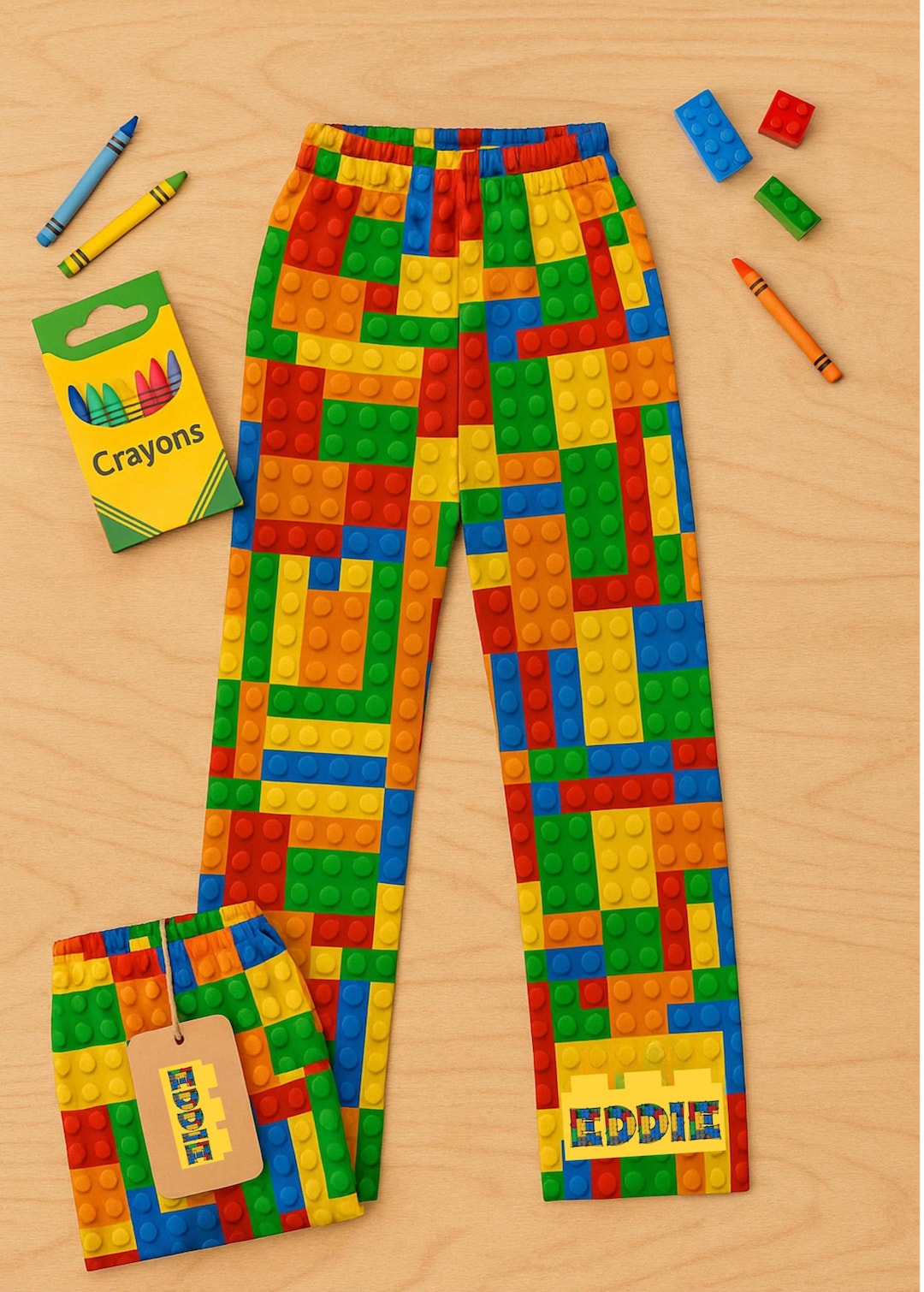These custom building block bottoms are the perfect gift for any building block or lounging fan! Made from soft and breathable fabric, these bottoms feature a fun and bold building block print with your custom name added to the bottom of both the front and back. Whether for cozy nights at home or relaxing weekends, these personalized bottoms are sure to bring a smile! 💖