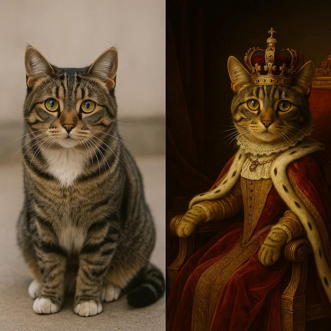 Upload your pet’s photo, and we’ll transform them into a King, Queen, Prince, or Princess — complete with crowns, robes, and that unmistakable royal attitude. This isn’t just a portrait… it’s your pet’s coronation day.