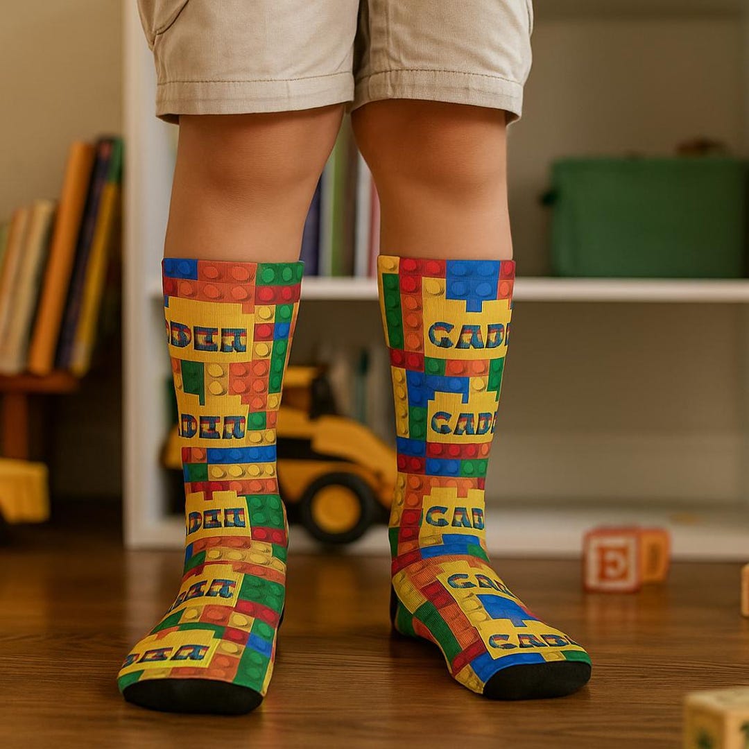 Step into fun with these playful, custom name socks inspired by colorful building bricks! Perfect for kids or anyone who loves creative, nostalgic designs. Each pair features your chosen name woven into a vibrant 3D-style brick pattern that brings instant joy to every outfit — from cozy weekends to themed parties.