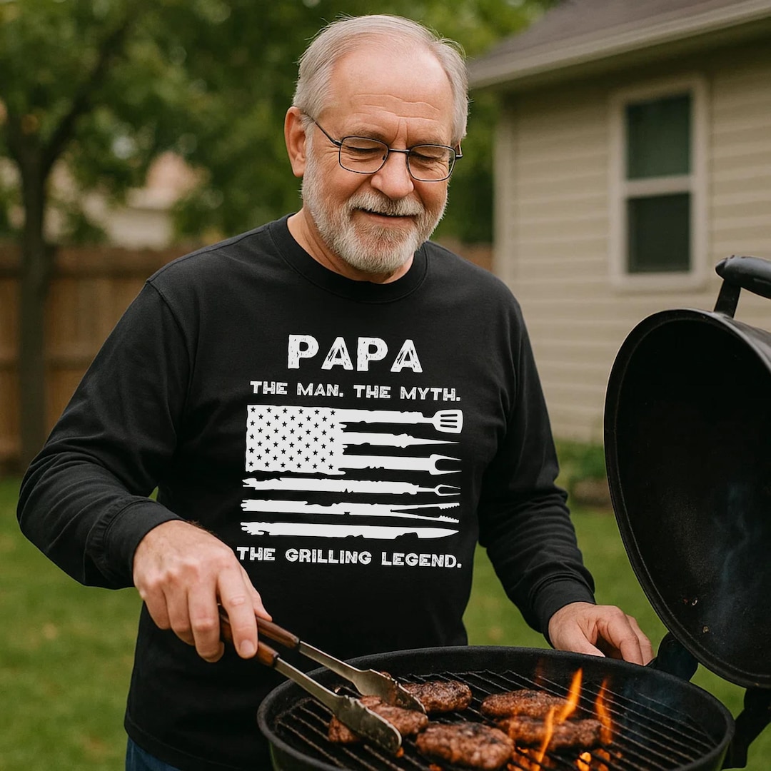 * Bold “Man. Myth. Grilling Legend.” design — customize the name (Papa, Grandpa, Dad, etc.)