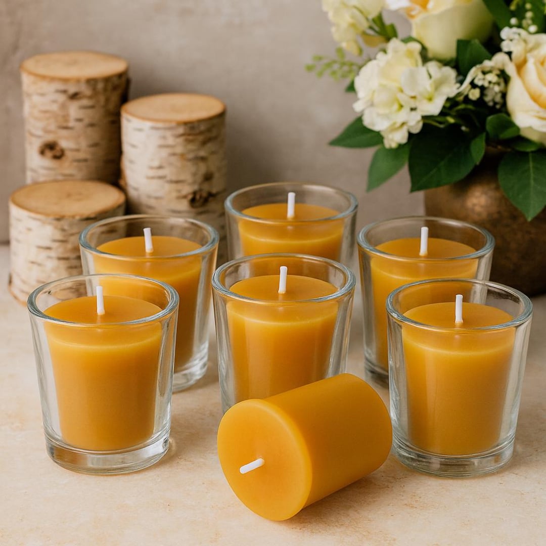 Bring a warm, golden glow to your space with our **100% pure beeswax votive candles**, available in sets of **1, 3, 6, or 10**. Each candle is lovingly hand-poured using only natural beeswax and **lead-free cotton wicks**, ensuring a clean, eco-friendly burn.