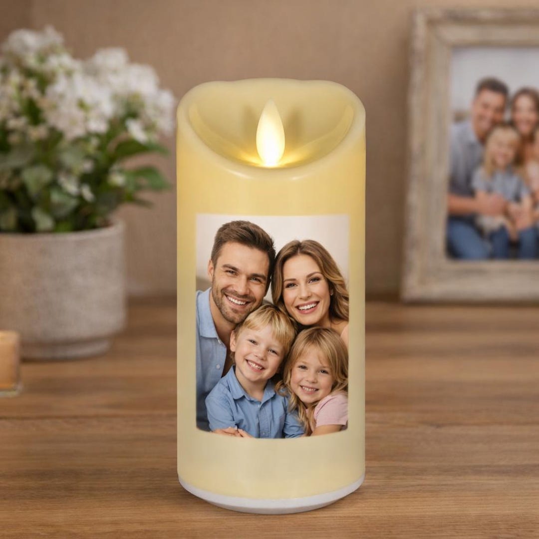 Introducing our Custom Photo Flameless LED Candle from 3D Candle Creations — a modern keepsake that transforms your favorite photo into a warm, glowing tribute. Designed with the look of a real ivory wax pillar and powered by safe LED technology, this rechargeable candle brings comfort and elegance to any space.