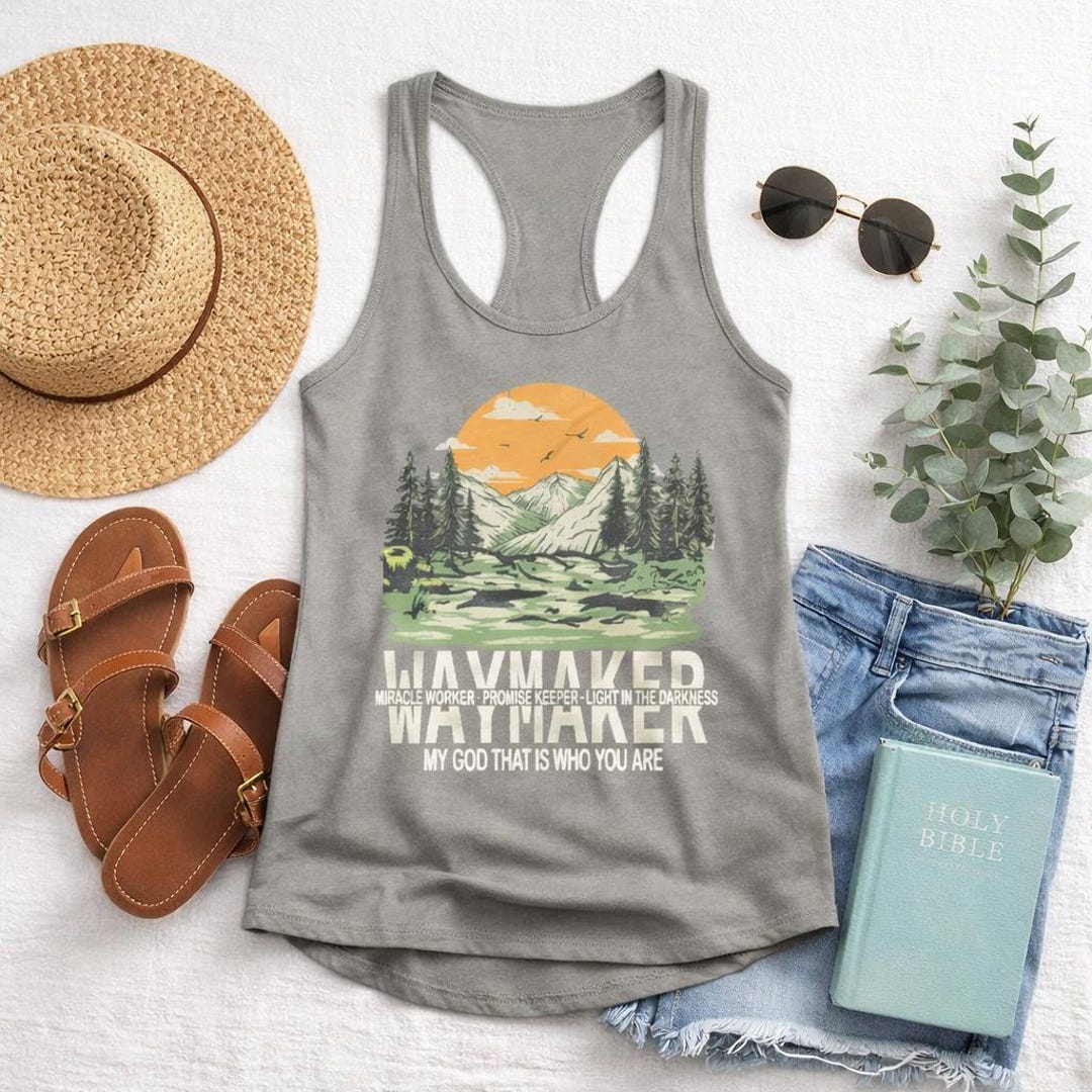 🌿 Embrace your faith and love for the outdoors with our captivating "Waymaker Miracle Worker Promise Keeper Light in the Darkness My God That Is Who You Are" tank top! 🌟 This Christian-inspired tank is a testament to your spiritual journey and appreciation for nature.