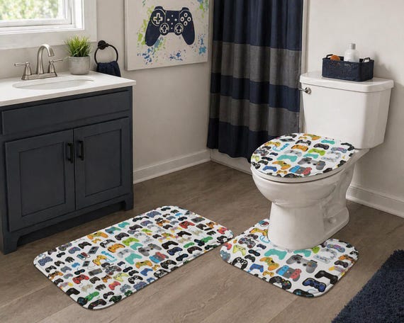 3-Piece Gamer Bathroom Rug and Toilet Set: Video Game Controller Decor for Boys by 3DCandleCreations