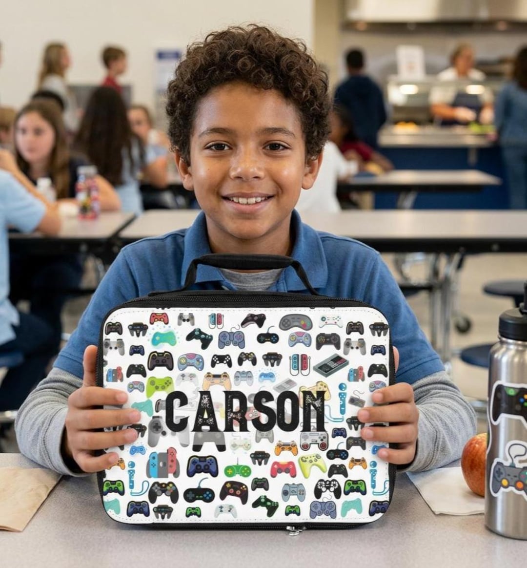 🎮 Personalize the front of the lunch bag with your child's name in the center, surrounded by their favorite video game controllers.