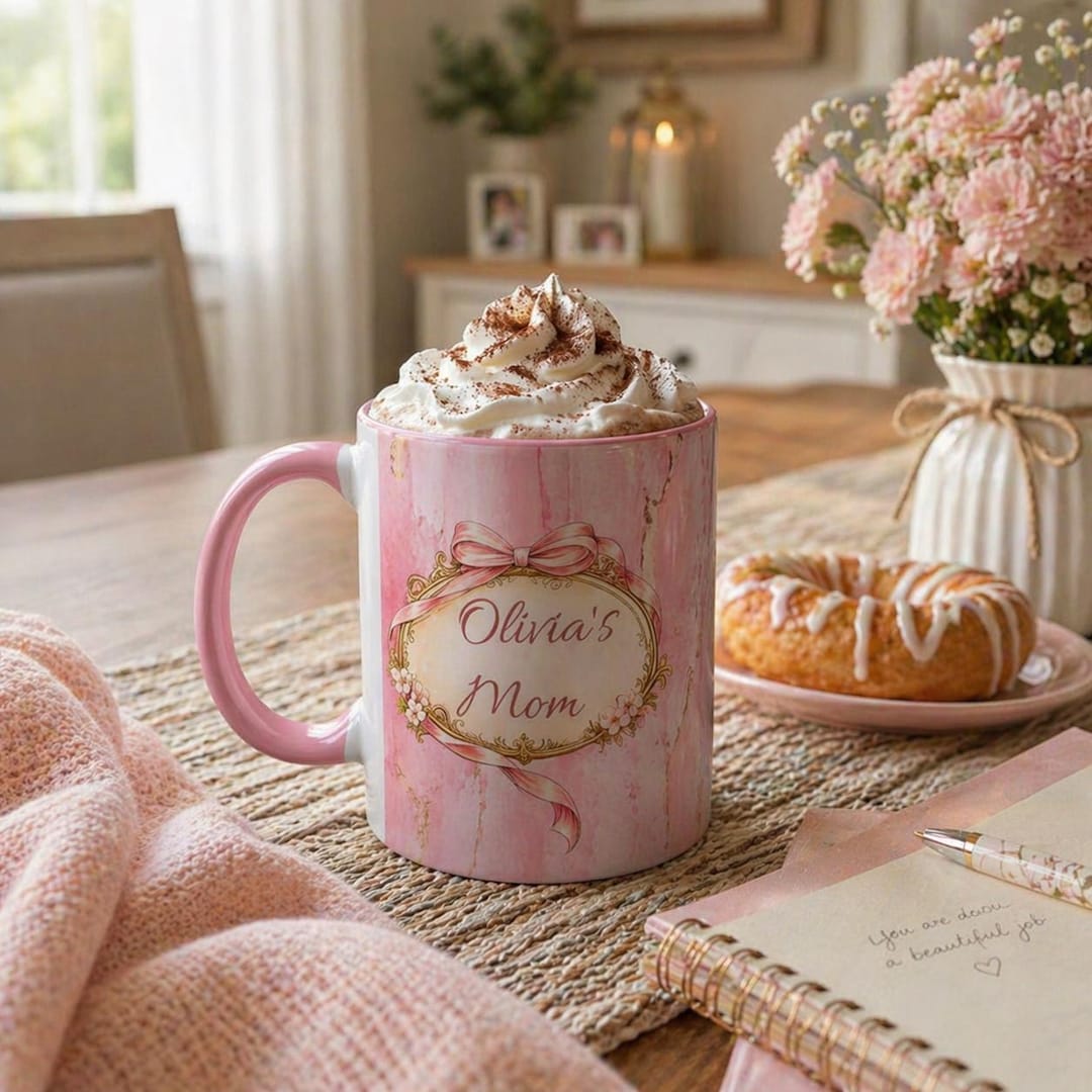 Soft watercolor washes of pink and delicate gold accents frame a vintage-inspired ribbon wreath, creating a gentle feminine design that brightens slow mornings and busy afternoons alike. Personalized with your child’s name, this mug turns an everyday coffee or tea moment into something meaningful — a quiet reminder of the connection that matters most. The glossy ceramic finish gives the artwork beautiful depth, while the colored handle and interior add a graceful pop of personality with every sip.