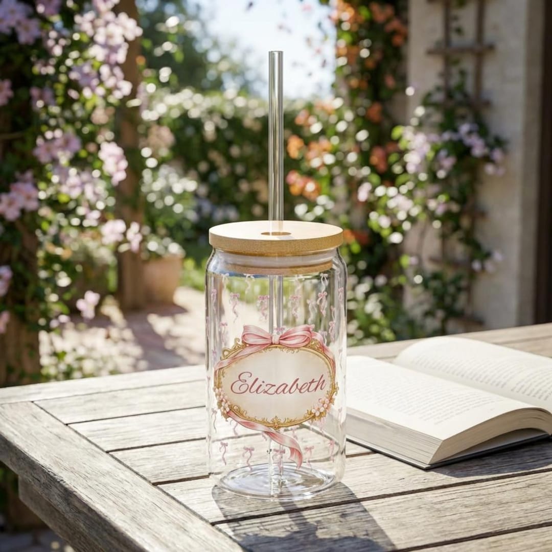 Designed with a graceful coquette aesthetic, this personalized glass cup is perfect for iced coffee lovers, bridesmaids, daughters, moms, teens, and anyone who loves feminine details and thoughtful custom gifts.