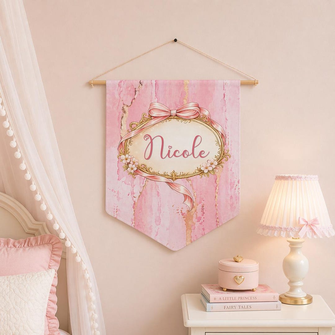 Create a soft, meaningful space for your daughter with this personalized pink floral name pennant designed to bring warmth, charm, and a timeless feminine touch to her room. The watercolor marble background, delicate ribbon bow, and vintage-inspired gold frame surround her name like a keepsake made just for her — perfect above a crib, bed, reading nook, or dresser wall.