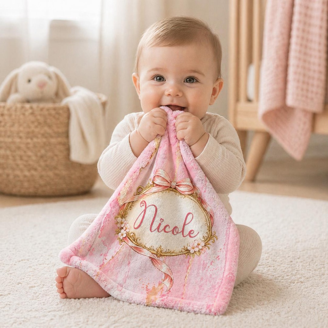 The watercolor pink background with the delicate ribbon frame creates a calm heirloom nursery look that makes this lovey especially meaningful as a baby girl gift or newborn keepsake 🎀 Adding a name turns it into something personal that parents often include in hospital bags, diaper bags, and bedtime routines from the very beginning.